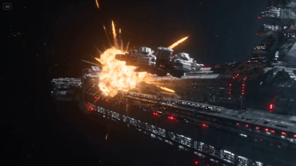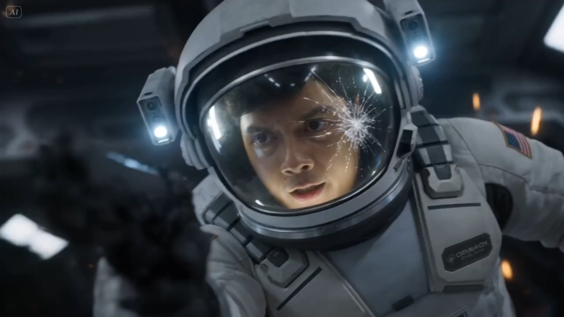 Tokoh utama @Gambar1 Scene 1: Stasiun luar angkasa raksasa mengorbit planet, alarm merah menyala. Scene 2: Ledakan terjadi, bagian stasiun hancur, puing-puing melayang tanpa gravitasi. Scene 3: Pasukan bersenjata bertarung dalam kondisi zero gravity, peluru melayang lambat. Scene 4: Seorang prajurit mendorong dinding untuk bergerak cepat, menembak sambil berputar di udara. Scene 5: Musuh muncul dari arah atas dan bawah, orientasi ruang menjadi kacau. Scene 6: Close-up helm retak, oksigen bocor perlahan, napas semakin berat. Scene 7: Ia menggunakan jet kecil untuk bermanuver, menghindari peluru dan puing. Scene 8: Granat dilepaskan, ledakan mendorong semua objek ke arah berbeda. Scene 9: Pertarungan jarak dekat terjadi di udara, tanpa pijakan, brutal dan cepat. Scene 10: Ia berhasil mencapai inti stasiun, menanam perangkat penghancur. Scene 11: Ia meluncur menjauh saat ledakan besar menghancurkan stasiun. Scene 12: Wide shot—puing-puing tersebar di orbit, tubuhnya melayang sendirian di angkasa.