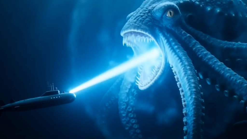 Tokoh utama @Gambar1 Scene 1: Laut dalam yang gelap, cahaya samar dari kapal selam kecil menembus kegelapan. Scene 2: Radar menangkap sesuatu yang sangat besar bergerak di bawah mereka. Scene 3: Close-up jendela kapal—mata raksasa terbuka di kegelapan, menatap langsung ke dalam. Scene 4: Kapal selam bergetar hebat, lampu berkedip, air mulai merembes masuk. Scene 5: Awak panik, mencoba naik ke permukaan, namun sesuatu mengikuti dari bawah. Scene 6: Makhluk raksasa muncul sebagian, tubuhnya bercahaya dengan pola bioluminescent. Scene 7: Salah satu awak tersedot keluar saat kaca retak, menghilang ke dalam kegelapan laut. Scene 8: Kapten memutuskan untuk menyalakan senjata energi terakhir. Scene 9: Sinar ditembakkan, menerangi seluruh lautan, memperlihatkan ukuran makhluk yang sangat besar. Scene 10: Makhluk itu mengaum tanpa suara, gelombang tekanan menghancurkan kapal. Scene 11: Semua menjadi gelap, hanya tersisa satu sinyal darurat yang berkedip. Scene 12: Di permukaan laut, air tiba-tiba bergolak… sesuatu akan muncul.